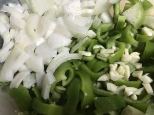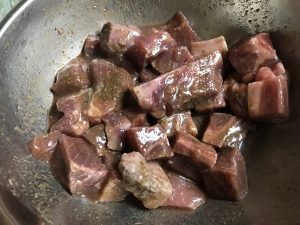 - Marinate cubed pork in Worcestershire, salt, pepper, and cumin. Set it aside while you prep all the veggies.