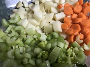- Chop harder ingredients (potatoes, carrots, celery, and chayote) in about ½” to 1” pieces.
