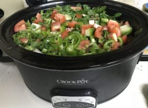 - Put hard ingredients and marinated meat in the slow cooker and then add the rest of the ingredients on top of that (onion, peppers, tomatoes, and garlic).