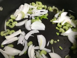• In a large pan, heat cooking fat on medium heat and add onion, celery, and peppers. Sautee for a couple of minutes.