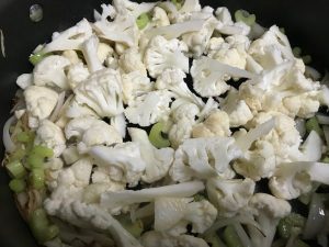 • When the onions start to soften up, add in the cauliflower and minced garlic. Season with salt, pepper, cumin (and any other seasoning you may want to use). Sautee for 10 minutes at medium-high heat or until cauliflower begins to soften.