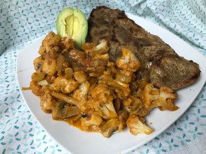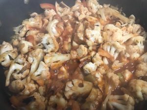 • Lower to medium heat and let it simmer covered for 4-8 minutes depending on how “al dente” you want your cauliflower. Stir around occasionally.