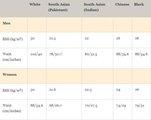 Also, just FYI, China and Japan define overweight as a BMI of 24 or higher and obesity a BMI of 28 or higher; in India, overweight is defined as a BMI of 23 or higher, and obesity, a BMI of 27 or higher.